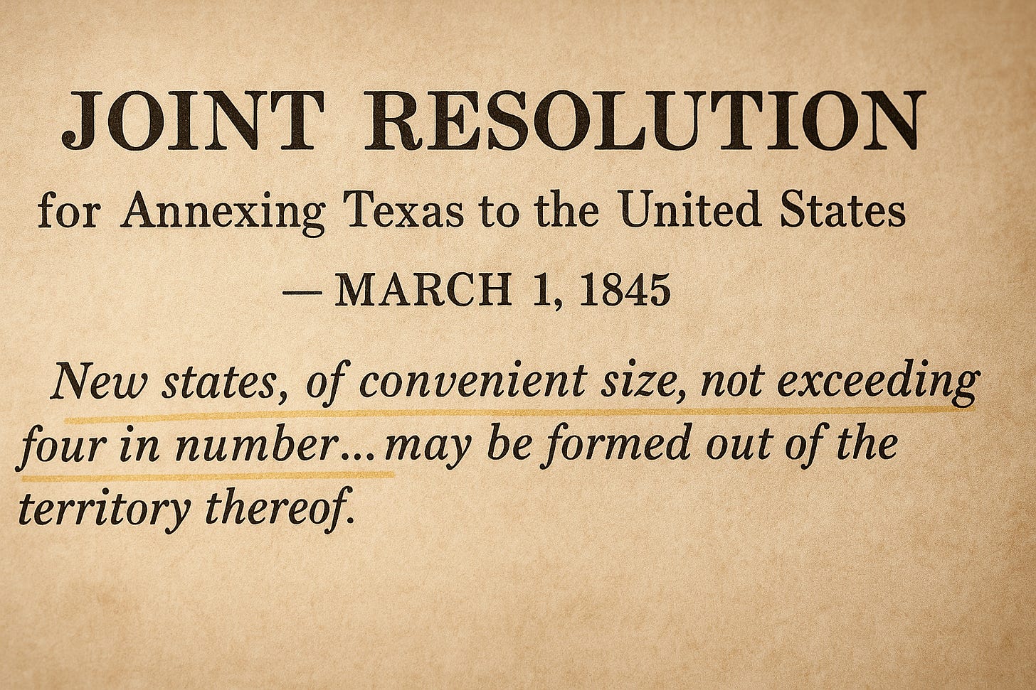 While the annexation of the Texas Republic by resolution and not treaty was unusual, the 19th century Supreme Court accepted that the resolution made Texas an irrevocable part of the Union. The resolution holds. The dispute is over whether Texas would have to seek additional approval for its new “little star” states to join the Union and there is a case that it does not. If the GOP thinks they will lose the Senate in 2026 this might stop being fantasy.