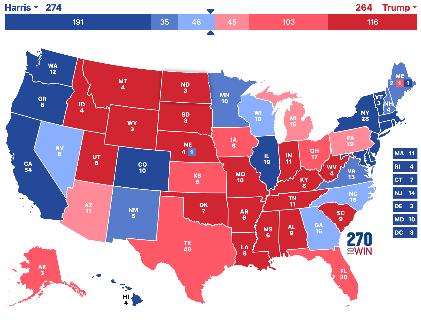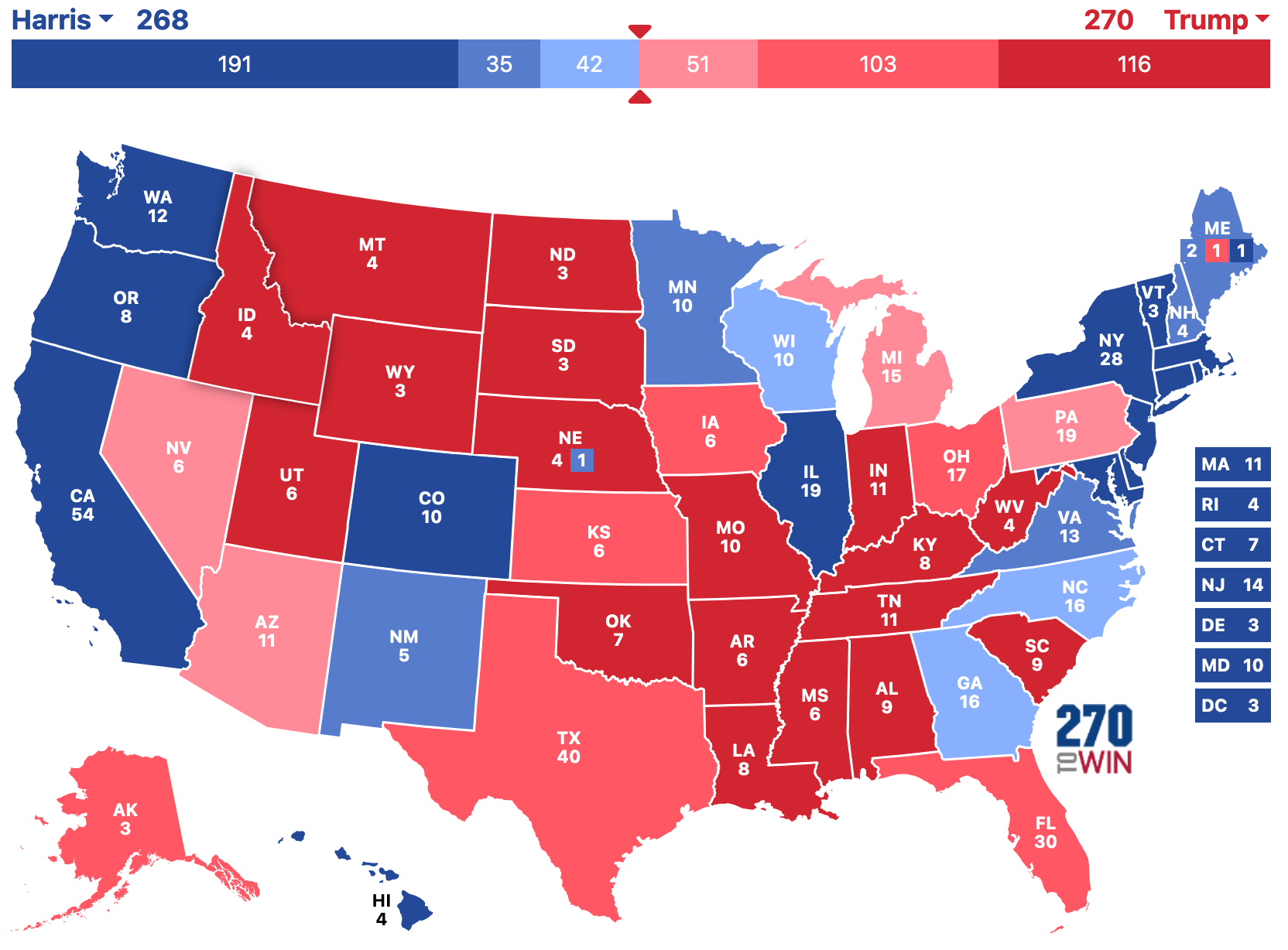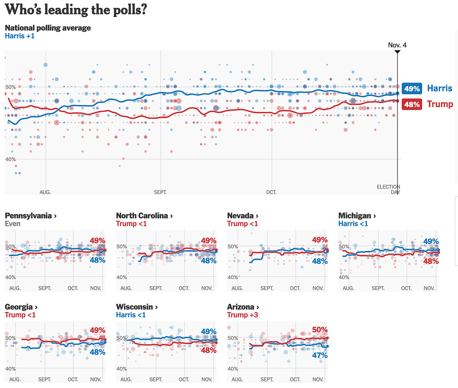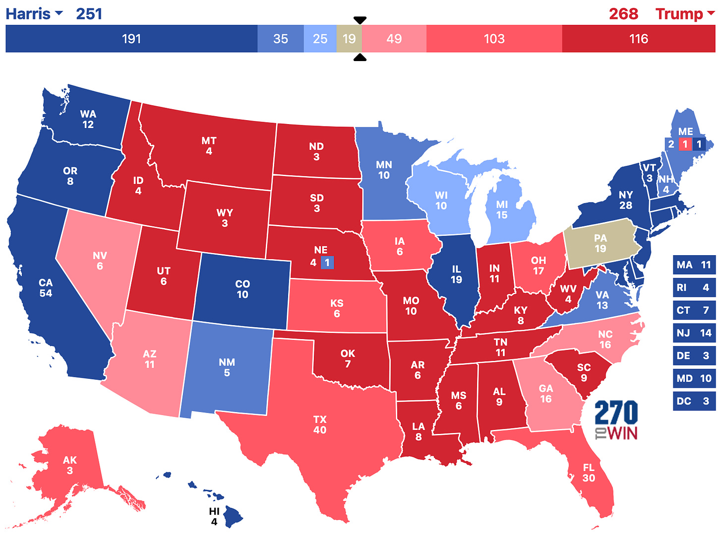 But again the Number One reason for this shift is that Trump’s political narrative has become stagnant. In wrestling, stars must evolve to stay relevant. Even the most hated villains refresh their personas to keep fans invested. Trump, however, has continued with the same tactics: insults, grievances, and re-litigating past battles. It is suffocating. And this is his third time running almost the same campaign as 2016, and as a result, his political narrative feels old and worn out. My working theory is that undecided voters - are there any left? - will break for Harris as Trump is well known and people have made up their minds about him already. If you are still doubting at the late date, I don’t think you are voting for Trump. Americans want something different; in fact, you have to go back to 1976 to find a presidential race without anyone named Bush, Clinton, Biden, or Trump on either ticket. Seriously, think about it. And with Trump it is even more in your face. It’s the same thing day after day, night after night. And Americans are kind of done with it. He attracts bad candidates to the GOP, like the candidate for North Carolina governor who is trailing the Democratic candidate by double digits. Only Trump would have a comedian make an amazingly bad joke about immigrants and Puerto Ricans. Americans are over it. And they have a way to make it stop: voting for Kamala Harris. And they may be enough to lose the election. But it may not. I think that if North Carolina and Georgia go for the same candidate, we will have our winner early, but if they split, it may come down to the 17 electoral votes of Arizona and Nevada at the end of the night.