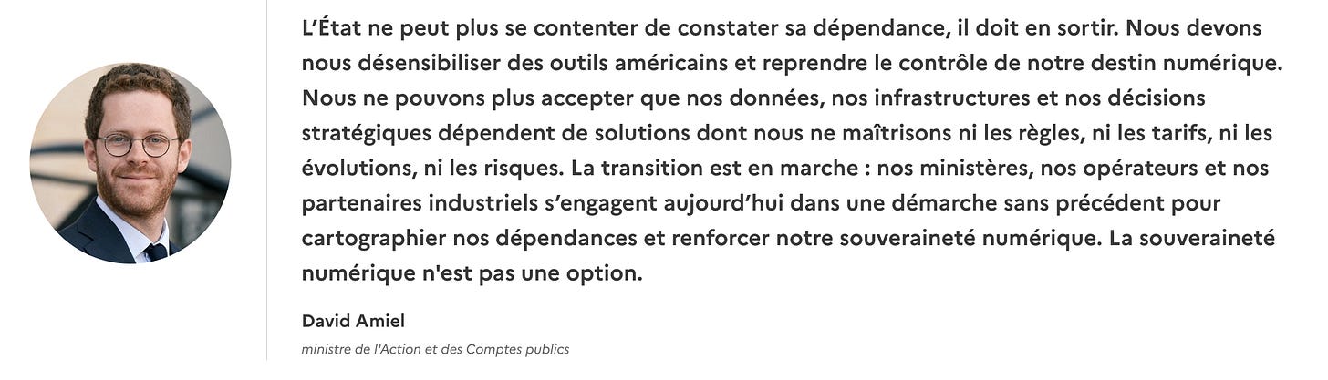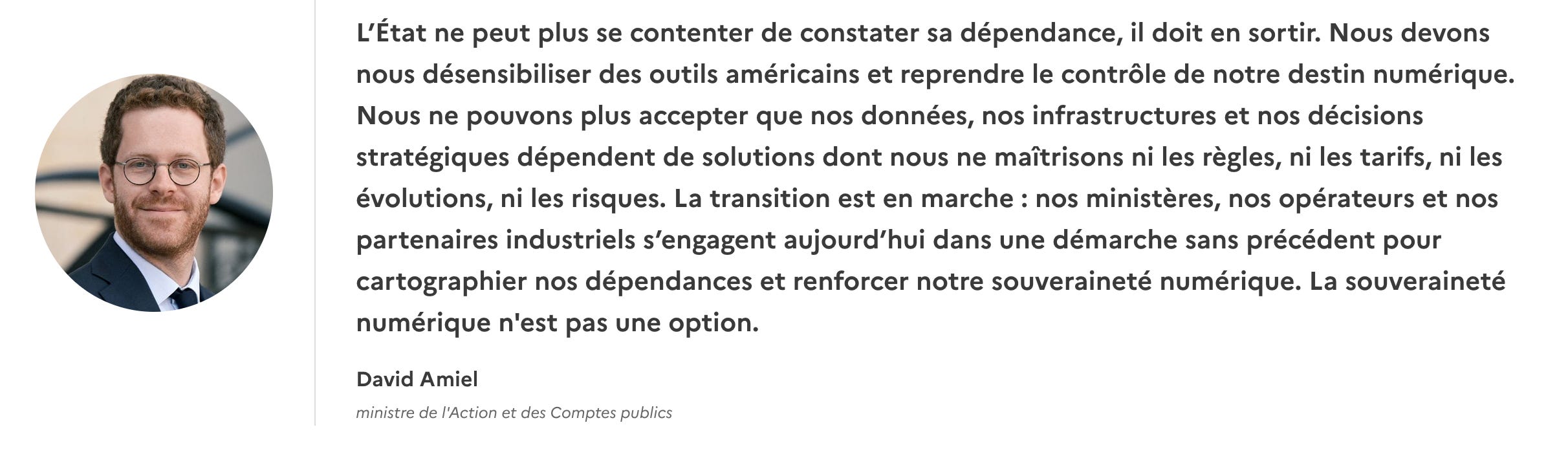 The State can no longer merely observe its dependency; it must break it. We must desensitize from American tools and reclaim our digital autonomy. We can no longer accept that our data, infrastructure, and strategic decisions rely on solutions where we have no control over regulations, pricing, technical roadmaps, or risks. The transition is underway: our ministries, agencies, and industrial partners are launching an unprecedented effort to map our dependencies and reinforce our digital sovereignty. Digital sovereignty is not optional. [emphasis added]. — David Amiel