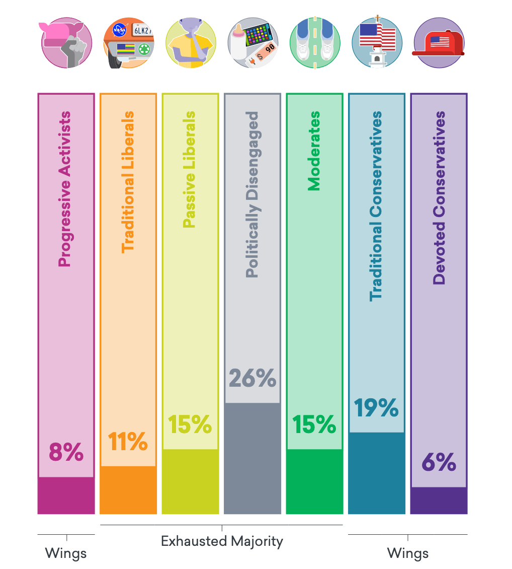 Back in 2018, the group More in Common produced a report called “The Hidden Tribes of America”1 Their research divided the US electorate into seven groups: