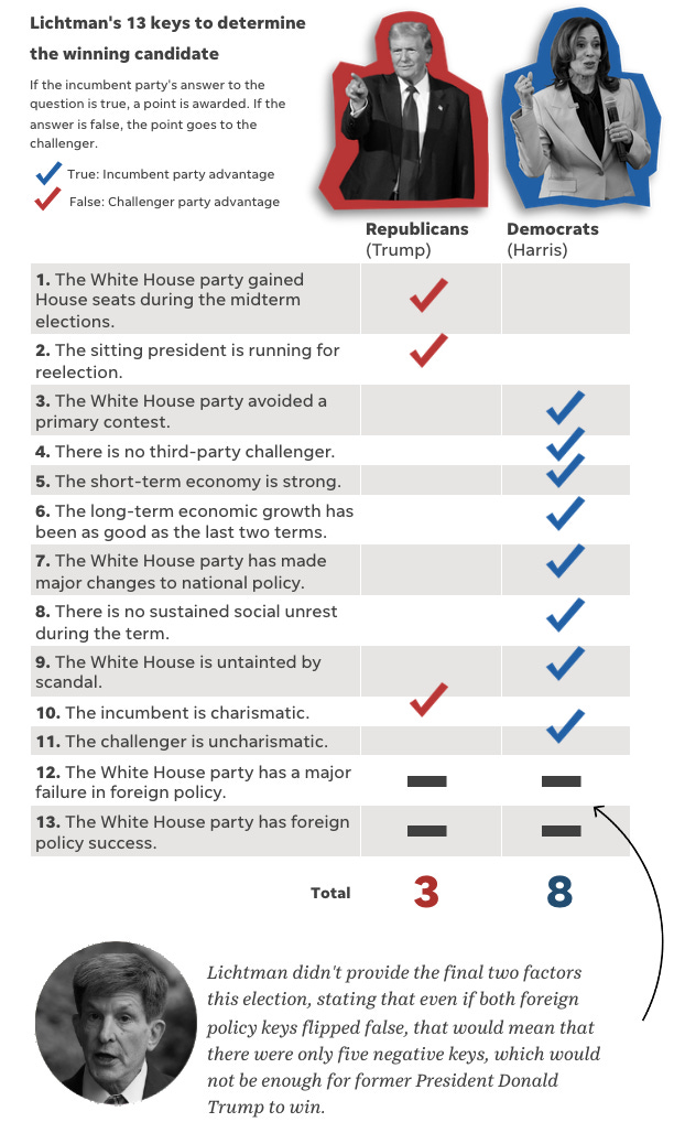 Dr. Allan Lichtman’s "Keys to the White House" model is a system for predicting U.S. presidential election outcomes, which he developed with Russian geophysicist Vladimir Keilis-Borok, based on perceived patterns from historical election data. The model uses 13 "keys," or true/false statements, to assess whether the incumbent party in the White House is likely to win or lose the upcoming election. If six or more of the keys are false, it predicts that the incumbent party will lose; otherwise, it predicts a win. Lichtman predicted a Harris win. Were the keys wrong?
